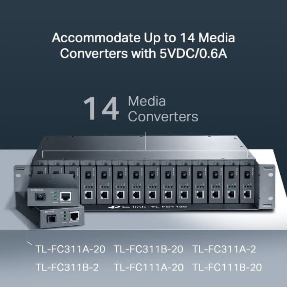 เป็นตู้ชาสซี (rackmount chassis) ขนาด 19 นิ้ว สูง 2U สำหรับติดตั้ง Media Converter ได้ถึง 14 ช่อง ภายในตู้เดียว พร้อมรองรับแหล่งจ่ายไฟสำรอง (redundant power supply option) และฟังก์ชัน hot-swappable (ถอด / ใส่โมดูลได้โดยไม่ต้องปิดตู้) โดยมีพัดลมภายในช่วยระบายความร้อนเพื่อประสิทธิภาพที่เสถียร