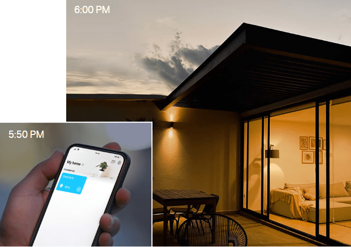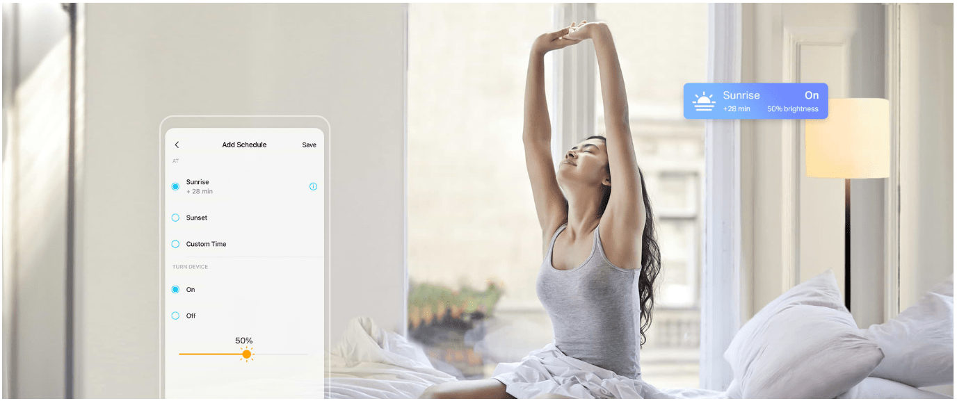 Create a regular schedule to turn on/off with the brightness you set. Sunrise and sunset modes allow the light to activate automatically according to your time zone