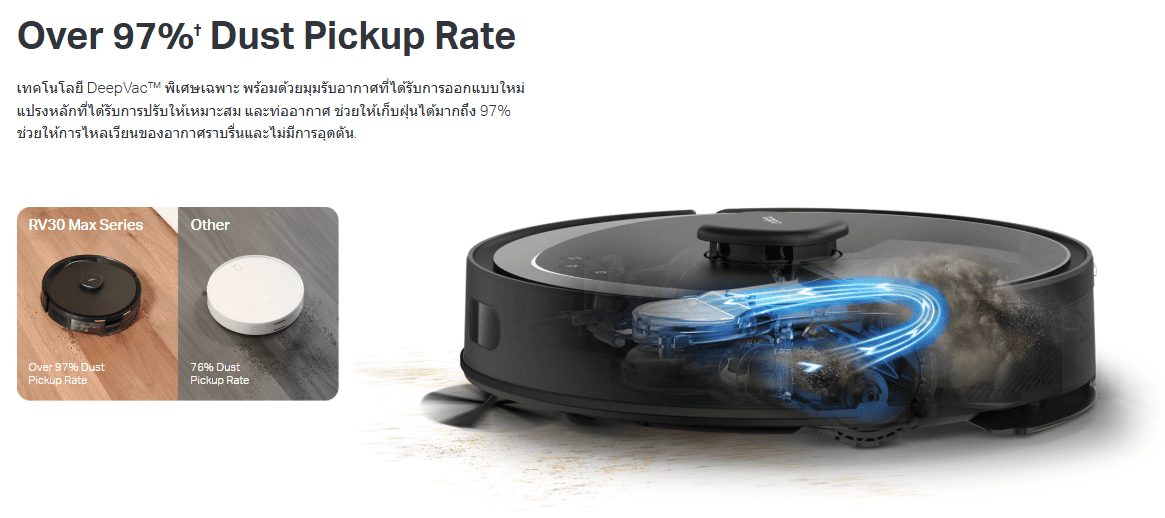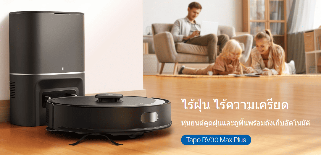 Tapo RV30 Max Plus หุ่นยนต์ดูดถูรุ่นเรือธงจากซีรีส์ Tapo ที่มาพร้อมพลังดูดสูงสุดถึง 5,300 Pa และแท่นเก็บฝุ่นอัตโนมัติ (Auto-Empty Dock) ที่มีกำลังดูดสูงถึง 17,000 Pa รองรับการถ่ายฝุ่นออกจากตัวเครื่องโดยไม่ต้องสัมผัสสิ่งสกปรก ตัวหุ่นยนต์ใช้ระบบนำทางแบบ LiDAR + IMU Dual Navigation เพื่อสร้างแผนที่แม่นยำระดับเซนติเมตร สามารถทำงานได้หลายชั้น (Multi-Floor Mapping) และตั้งค่าพื้นที่จำกัดหรือโซนห้ามเข้าได้ผ่านแอป Tapo App เหมาะสำหรับบ้านยุคสมาร์ทที่ต้องการความสะดวกสบาย ควบคุมผ่านมือถือหรือเสียง (Alexa / Google Assistant) ได้เต็มรูปแบบ