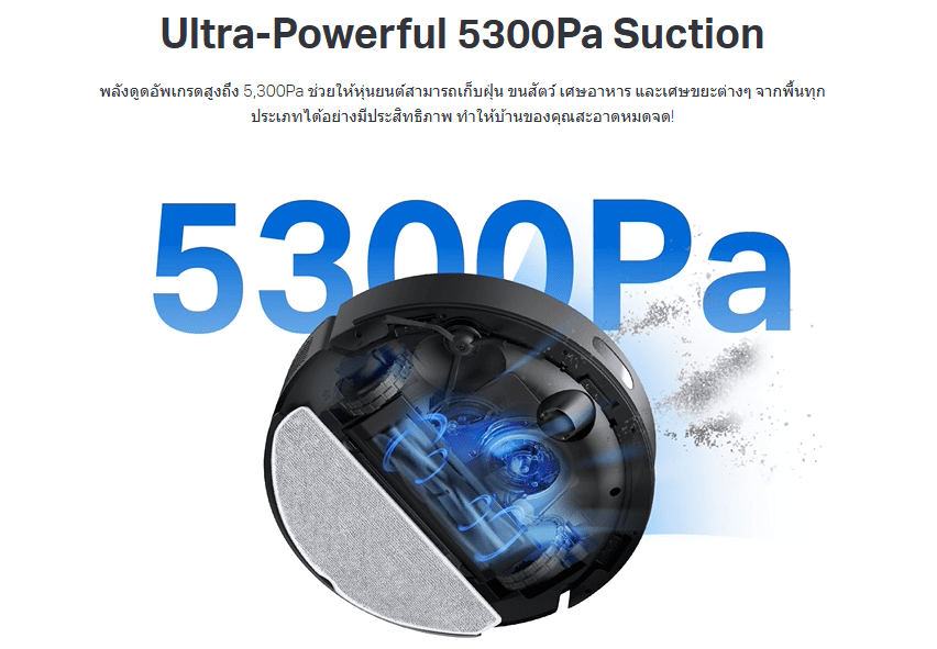 - พลังดูดแรงสูง 5,300 Pa สำหรับการดูดฝุ่น เส้นผม และเศษเล็กละเอียด