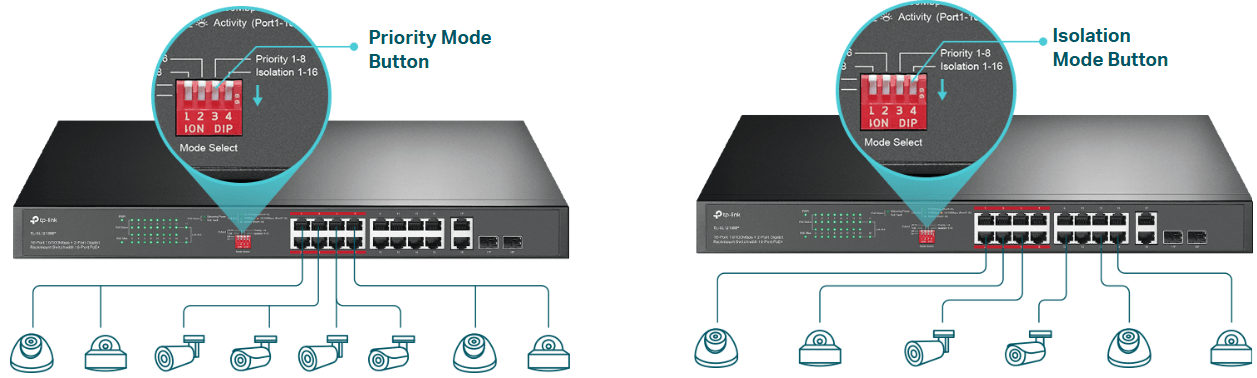 | Priority Mode / Isolation Mode | รองรับ Priority Mode (พอร์ต 1–8) และ Isolation Mode เพื่อแยกทราฟฟิก |