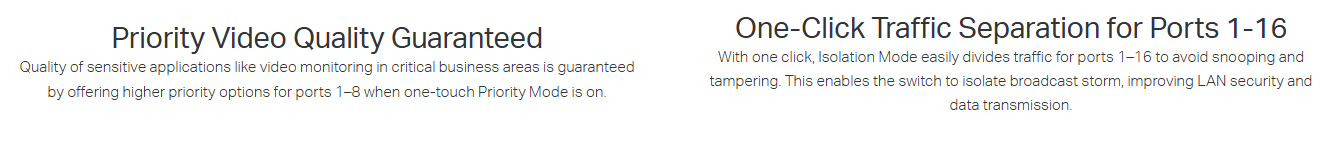 - ฟีเจอร์ Priority Mode สำหรับพอร์ต 1–8 ให้ประสิทธิภาพสูงสำหรับงานกล้อง / วิดีโอ