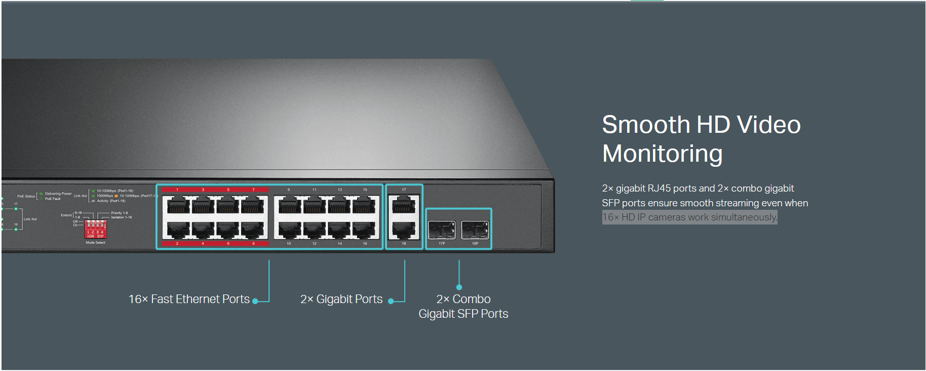 | Interface | • 16 PoE+ 10/100 Mbps RJ45 Ports • 2× 10/100/1000 Mbps RJ45 Ports • 2× Combo Gigabit SFP Slots |