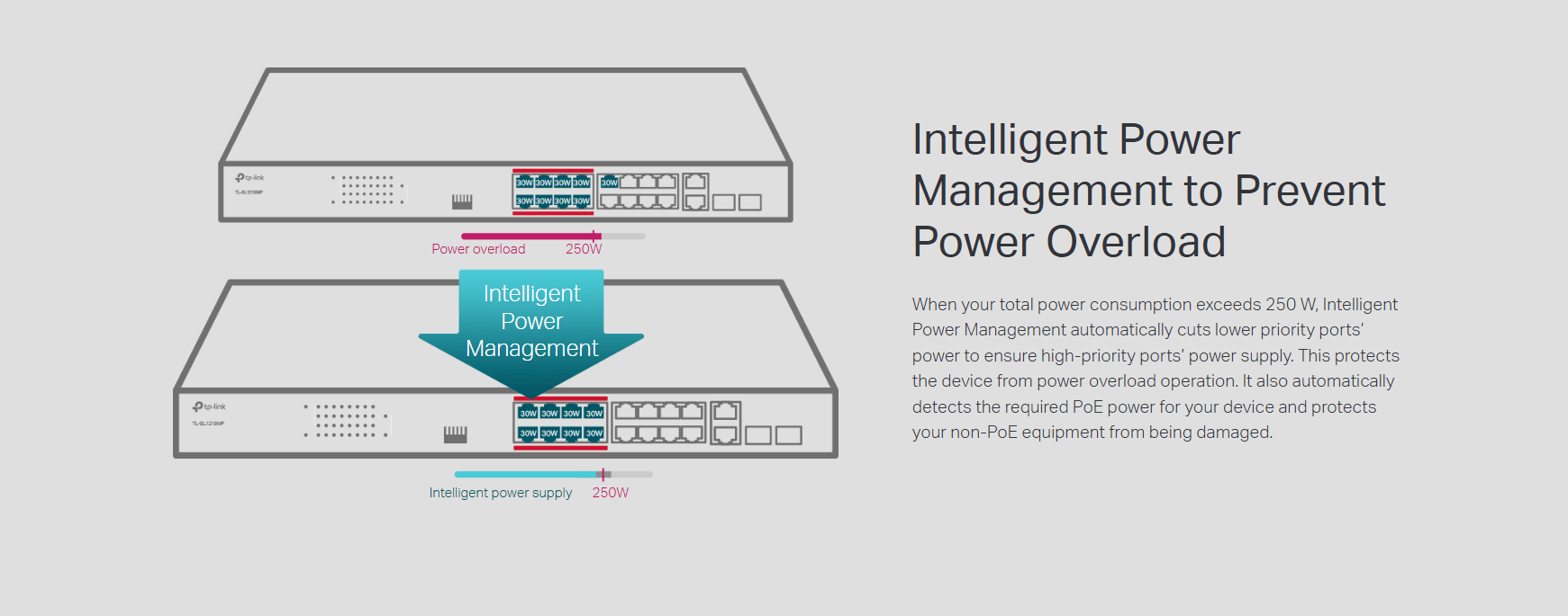 - High PoE power budget with up to 30 W for each PoE port and 250 W for all PoE ports.*