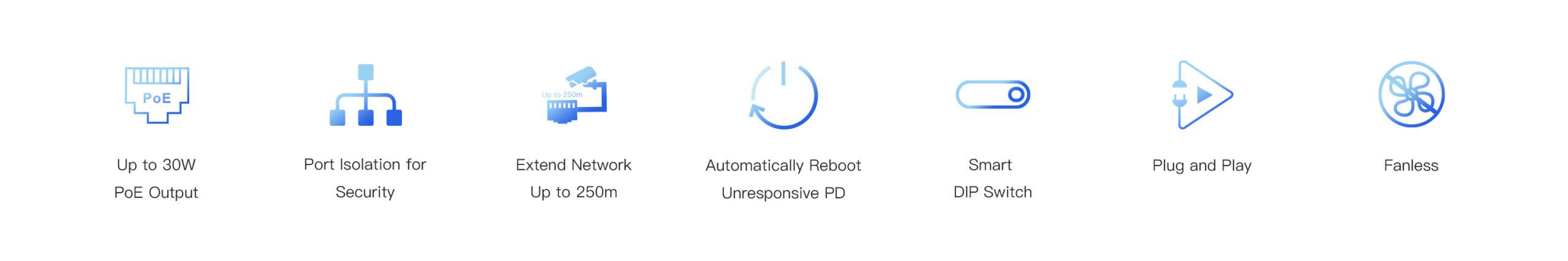 - รองรับโหมด Extend ระยะไกลได้ถึง 250 เมตร, ฟังก์ชัน Port VLAN และ PD Alive ผ่านสวิตช์ DIP เพื่อการจัดการเครือข่ายที่ง่ายและยืดหยุ่น