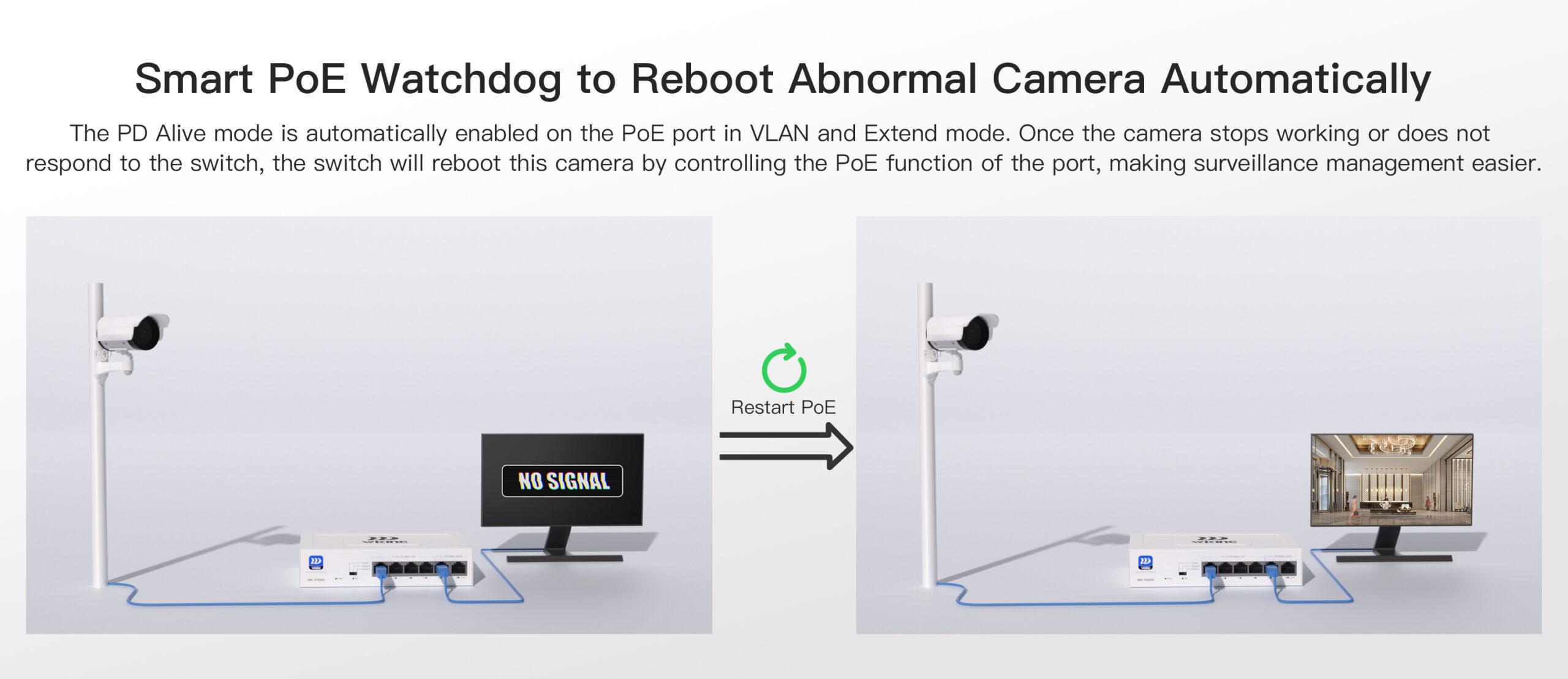 - โหมด PD Alive ตรวจจับและรีบูตอุปกรณ์ที่ใช้พลังงานผ่าน PoE โดยอัตโนมัติเมื่อไม่ตอบสนอง เพื่อให้ระบบทำงานได้ต่อเนื่อง
