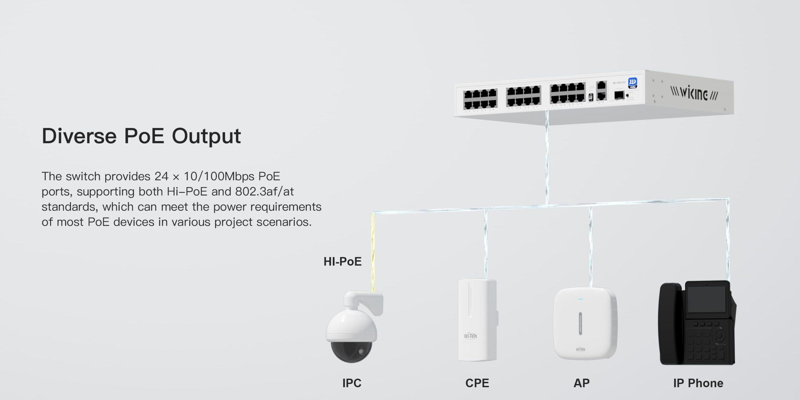 • พอร์ต PoE 24 พอร์ต ความเร็ว 10/100Mbps, พอร์ตอัปลิงก์ RJ45 2 พอร์ต ความเร็ว 10/100/1000Mbps และสล็อต SFP 1 พอร์ต ความเร็ว 1000Mbps
